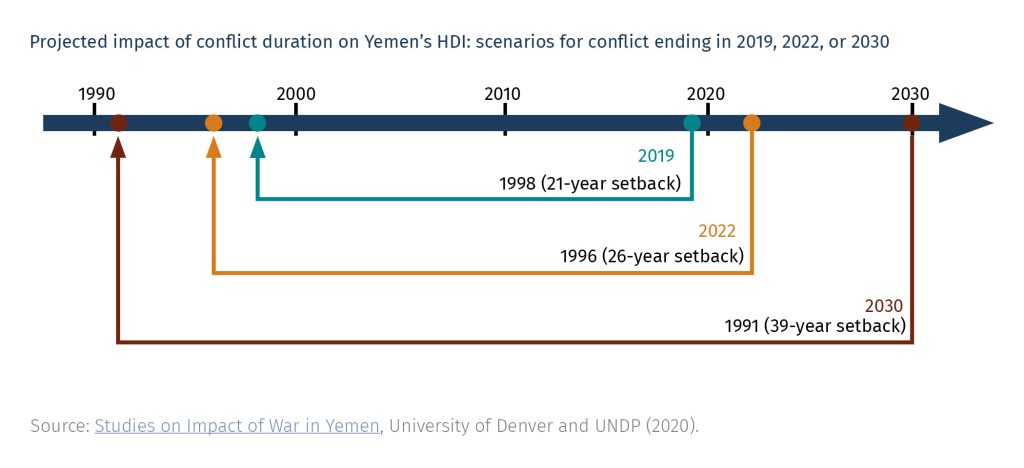 The ongoing conflict has further reduced the pace of development and exacerbated poverty and hunger. The impacts of conflict in Yemen are devastating – nearly 250,000 people have been killed directly by fighting and indirectly through lack of access to food, health services, and infrastructure. Of the dead, 60% are children under the age of 5. The long-term impacts of conflict are both vast and devastating, placing it among the most destructive conflicts since the end of the Cold War. The conflict has already set back human development by more than 20 years, as measured by the HDI.