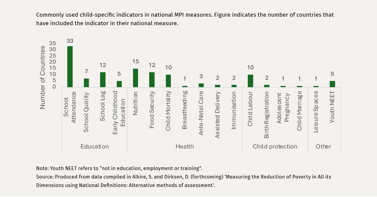 A wide range of child-specific indicators have been included in existing national MPIs. The six most common child indicators are school attendance (33 countries), nutrition (15 countries), school lag (12 countries), food security (12 countries), child mortality (10 countries), and child labour (10 countries). The inclusion of these indicators is often limited to data availability, as in the case of nutrition and child mortality, which are not always collected and so are often missing in MPI measures.