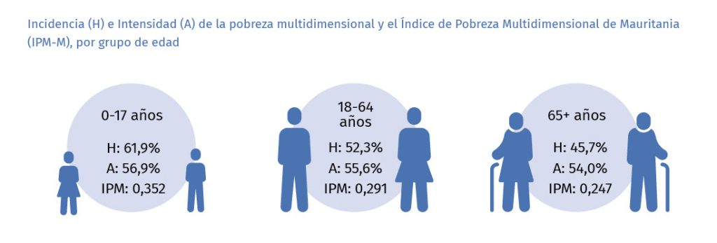 Los resultados del análisis de la pobreza multidimensional por grupo de edad muestran que los niños y las niñas sufren más de pobreza multidimensional que los adultos: entre los niños y las niñas de 0 a 17 años, el 61,9% es pobre multidimensional, en comparación con el 52,3% de los adultos de entre 18 y 64 años.