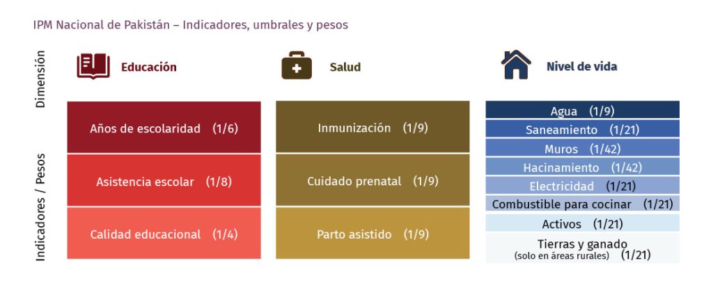 Recientemente, la Oficina de Estadísticas de Pakistán realizó un censo digital que cubrió a una población de 250 millones de personas. Este Censo recopiló datos sobre vivienda, nivel de vida, educación (matrícula, alfabetización y niños no escolarizados) y condiciones de vivienda. Lamentablemente, la salud – una de las tres dimensiones del IPM– no se incluyó en el Censo. Por lo tanto, aunque no podemos calcular el IPM completo con los datos del Censo, podemos usar la metodología para analizar las carencias en educación y nivel de vida. Este análisis parcial sigue siendo valioso para la formulación de políticas públicas y la focalización efectiva de los recursos.