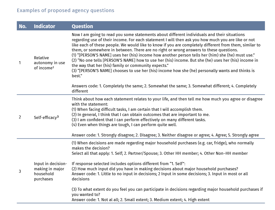 • Input in decision making: These are probably the most widely used and tested indicators of agency. They have been fielded by Demographic Health Surveys in many countries in past decades. One needs to keep in mind that these questions generally focus on household decisions, which makes them less suitable for households where there is only one potential decision-maker.